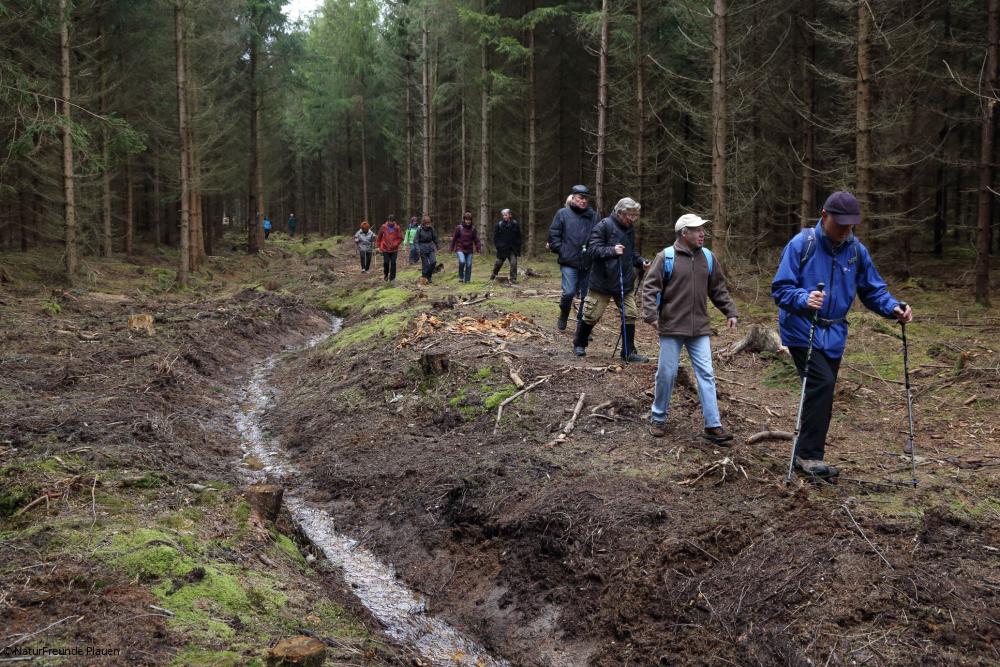 Wir wanderten von der Syra-Quelle im Mehltheuerer Forst bis zur Mündung in die Weiße Elster im Zentrum Plauens. Anfangs stolperten wir auf steinigen, feuchten und schlammigen Waldwegen zur Quelle, die sich kaum als solche zu erkennen gibt.
