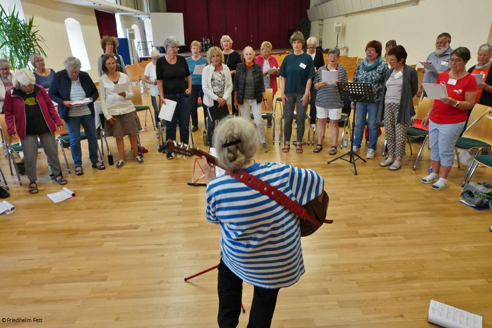 Auf Einladung der NaturFreunde Hessen sind sie aus der gesamten Bundesrepublik gekommen, ob nun im Alter von fünf Jahren mit den Eltern oder im Alter von 83 Jahren wie Paul Mehrer aus der Nähe Karlsruhes. Er war schon im Jahr 2005 erstmals dabei, lange Jahre Orchesterleiter und beschränkt sich nun – neben dem Singen – aufs Mandolinenspiel. Noch heute bedauert er die dreijährige Corona-Pause.