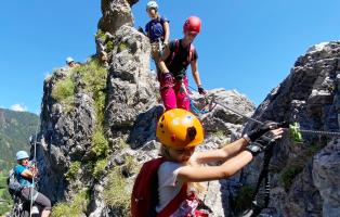 Dienstags klettern wir wieder, diesmal allerdings am Drahtseil mit Klettersteigset. Landschaftlich ein Highlight: die Galitzenklamm. Zunächst gehen alle den Familienklettersteig. Nach einer kurzen Rast folgt dann der anspruchsvollere Steig direkt durch die Klamm und über dem tosenden Wasser. Für unseren Jüngsten (und seine besorgten Eltern) eine echte Herausforderung! Während sich die Kleinen am Wasserspielplatz von dem Abenteuer erholen, gehen einige Unerschrockene noch den „Dopamin“-Klettersteig, der seinem Namen alle Ehre macht.